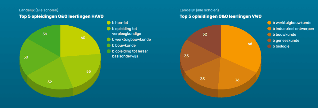 De top vijf hbo-opleidingen waar technasiumleerlingen na het behalen van hun havo-diploma voor kozen in 2020-2021 zijn: