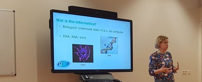 Docenten en studenten van Hogeschool Leiden vertelden over dit brede vakgebied én over de diverse mogelijkheden om leerlingen van het Technasium kennis te laten maken met bio-informatica. Zo biedt de hogeschool bijvoorbeeld expertbegeleiding voor leerlingen bij hun keuzeprojecten en Meesterproef. Ook biedt de opleiding een geheel verzorgd lespakket in de vorm van een challenge voor leerlingen door studenten.